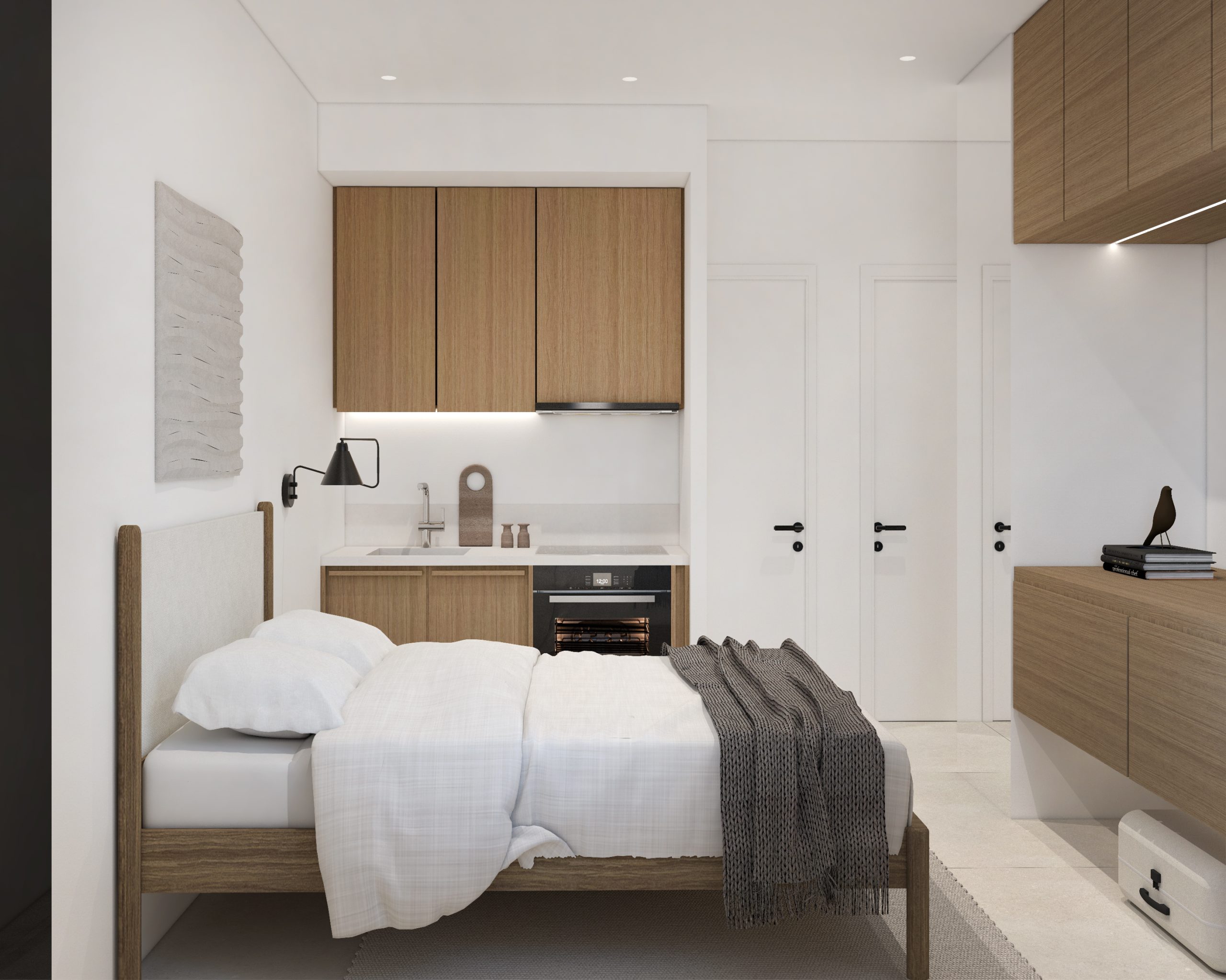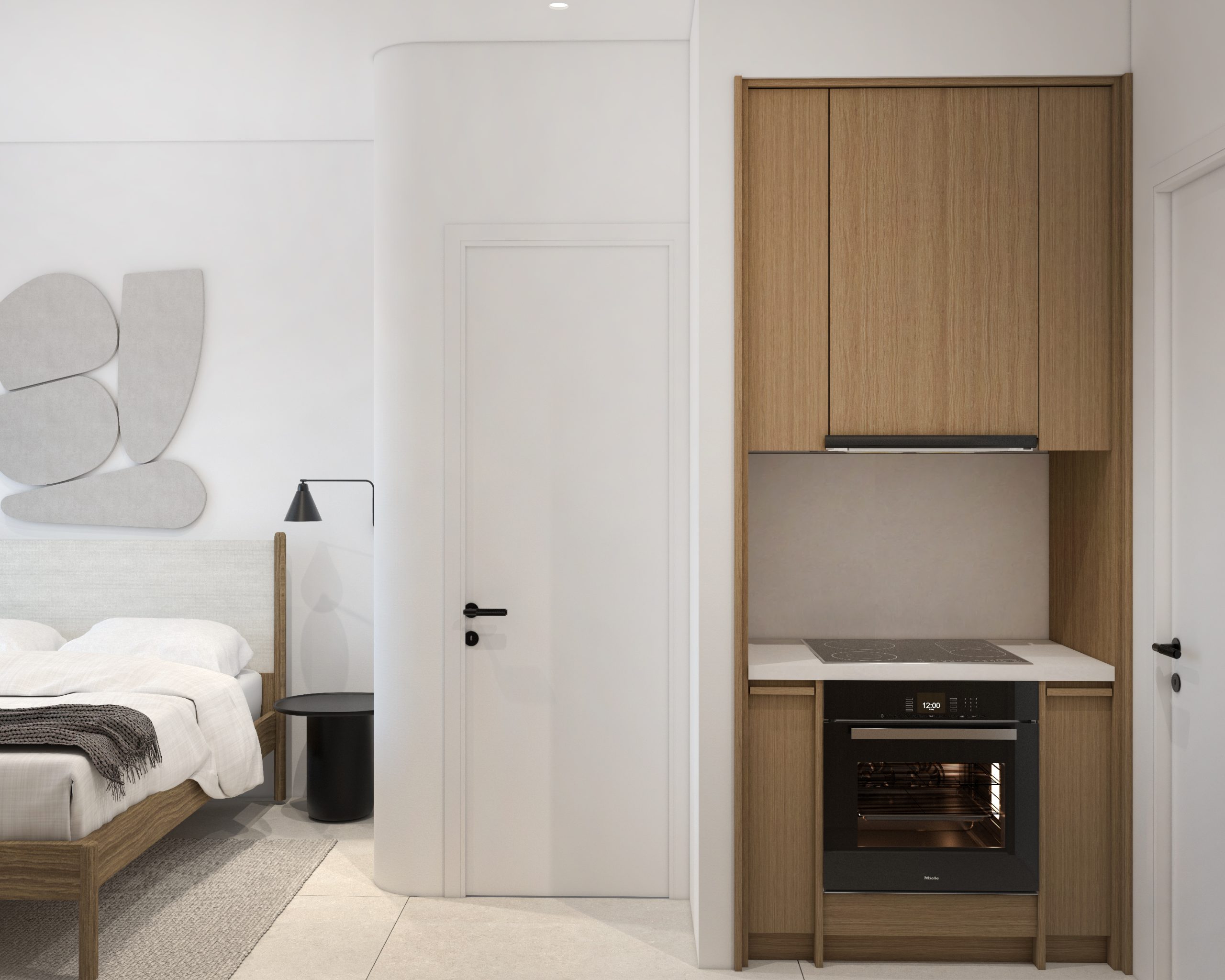 The design maximizes space with flexible, open-plan areas, emphasizing a clean, modern aesthetic. Each unit features a fully equipped kitchen, contemporary bathroom, and spacious bedroom areas, with a focus on natural light and ventilation.
